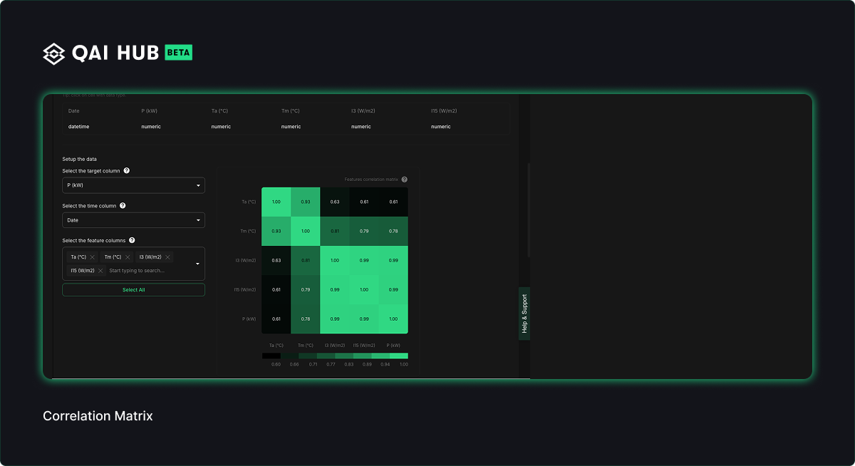 Start by creating a Forecasting solution and selecting one of the available demo datasets (e.g. synthetic energy demand data). QAI Hub instantly scans the dataset and profiles it with live correlation maps and distribution histograms — giving you an immediate sense of patterns, anomalies, and structure.