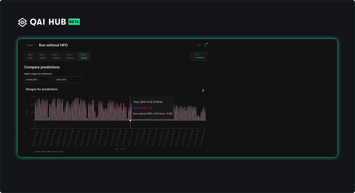 Great, you have your first Quantum AI model! QAI Hub shows you the full prediction journey, from prototype to insight—without requiring deep quantum knowledge.